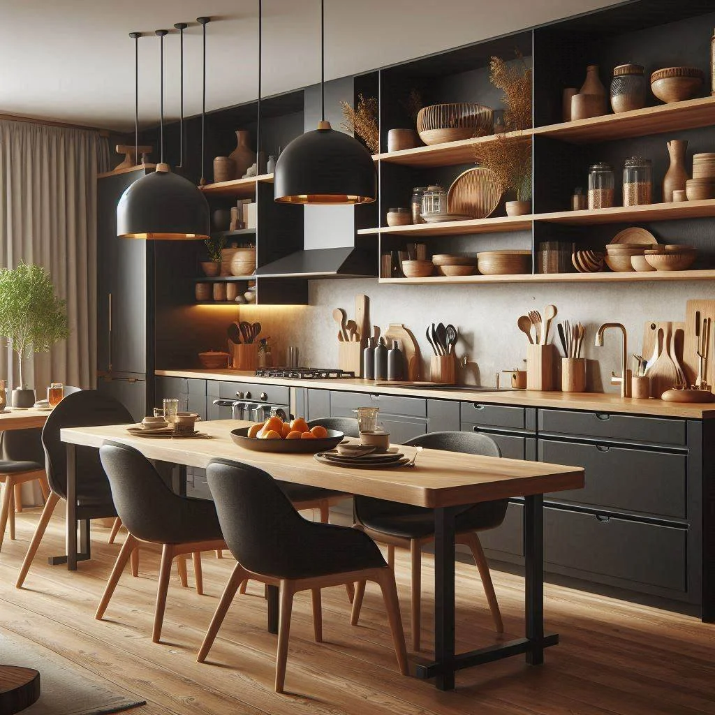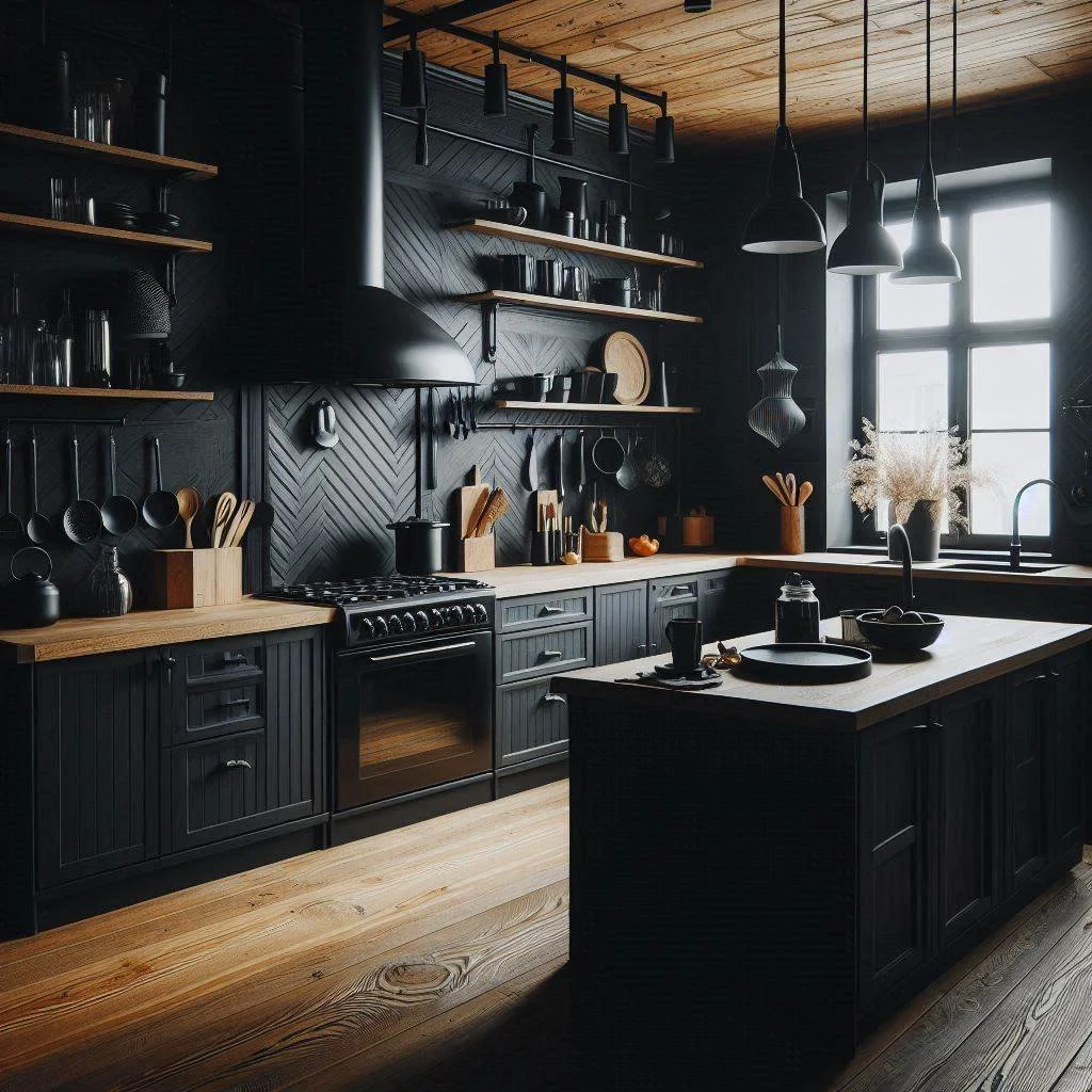 For a cozy and inviting kitchen, combining black elements with natural wooden accents creates a beautifully balanced aesthetic. Imagine black cabinetry paired with rich oak or walnut countertops— the deep, bold tones of black are softened by the warm, earthy hues of the wood. This blend of contrasting materials adds both sophistication and comfort, making the space feel modern yet welcoming. The natural texture of the wood complements the sleekness of black, creating visual depth and warmth that prevents the kitchen from feeling too cold or industrial. This combination works well in both large and small spaces, offering a timeless appeal that can suit various design styles. Whether you prefer light oak for a brighter feel or dark walnut for a more dramatic effect, the marriage of black and wood adds a perfect touch of elegance and comfort.