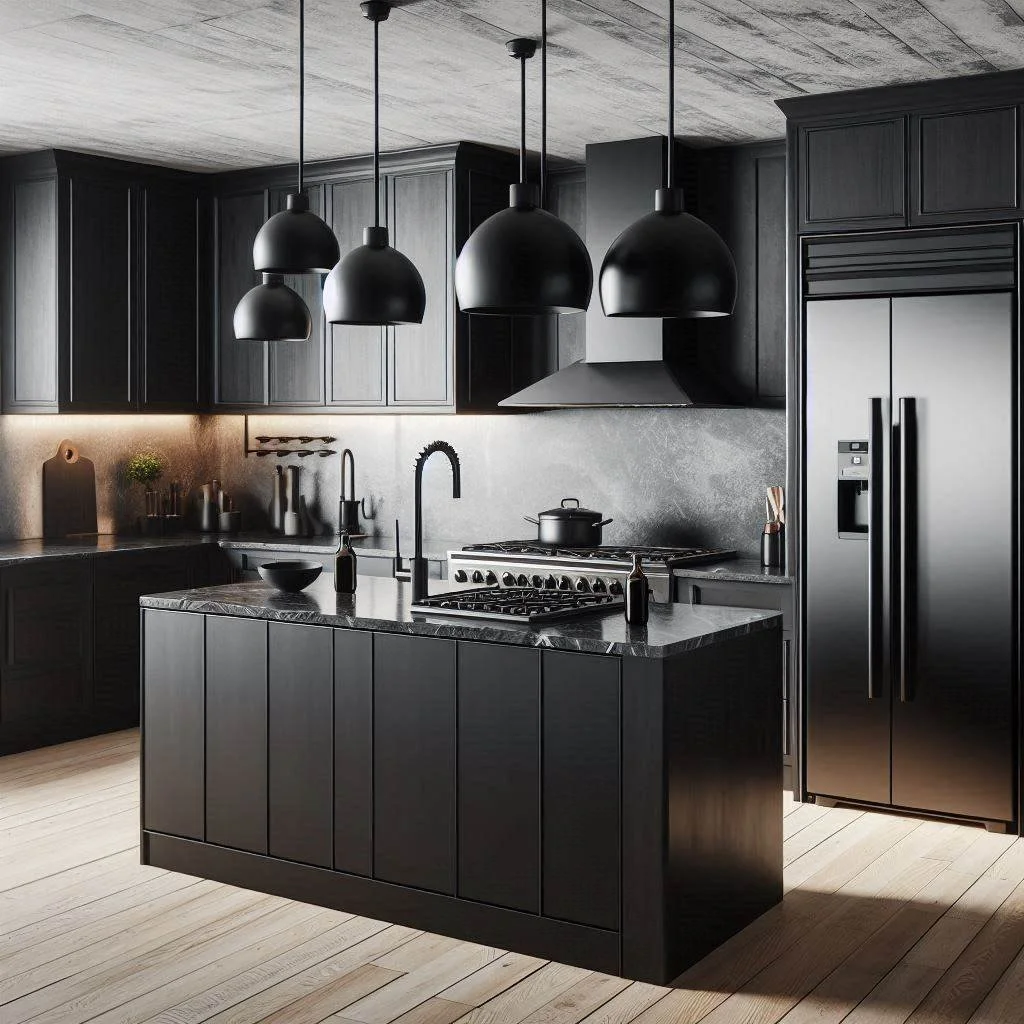 For a bold, dramatic kitchen design, go all-in with a monochromatic black theme. Black cabinets, countertops, and even walls create a sleek, cohesive look that exudes modern sophistication. This monochromatic approach offers a refined, high-fashion aesthetic that makes a strong statement in any space. However, to prevent the room from feeling too heavy or oppressive, incorporate textured elements to add depth and interest. Consider using exposed brick walls, patterned tiles, or textured fabrics for soft furnishings or accessories. These subtle variations in texture break up the solid black and introduce warmth and dimension, making the space feel more inviting while maintaining its sleek, contemporary vibe. A monochromatic black kitchen can be both bold and balanced with the right combination of materials and thoughtful design.