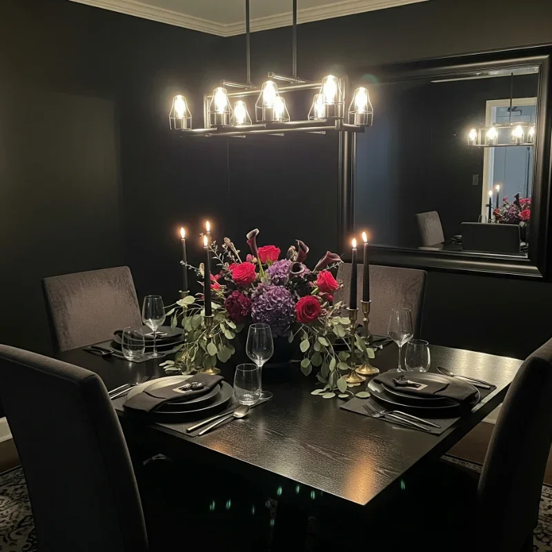 Transform every meal into an intimate occasion with a black dining room! Dark walls create instant ambiance, making even Tuesday night dinner feel special. A dramatic chandelier becomes essential: crystal, modern geometric, or vintage brass all work beautifully as centerpieces. Choose a dining table that contrasts: white marble, natural wood, or glass tops prevent the space from feeling too heavy. Upholstered chairs in jewel tones or rich textures add comfort and color. Mirrors strategically placed amplify light and create the illusion of space. Consider metallic wallpaper on one accent wall for added glamour. Candlelight becomes magical against black walls, creating flickering shadows and warm ambiance. This setting encourages lingering conversations and memorable gatherings. Your dining room transforms from functional space to destination, making every meal an event worth savoring.