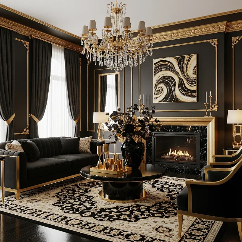 Elevate your living room to five-star hotel status with the timeless combination of black and gold! This pairing screams luxury without trying too hard. Paint walls in rich charcoal or true black, then layer in gold through lighting fixtures, mirror frames, and decorative accessories. A black velvet sofa becomes even more glamorous with gold throw pillows featuring geometric patterns or subtle textures. Coffee tables with gold legs or marble tops with gold veining bridge the two colors perfectly. The warmth of gold prevents black from feeling cold or oppressive. Add crystal elements for extra sparkle: a chandelier or decorative bowls catch light beautifully against dark walls. Don't forget artwork with gold frames or pieces incorporating both colors. This combination works especially well in formal living rooms or anywhere you want to make a lasting impression on guests.
