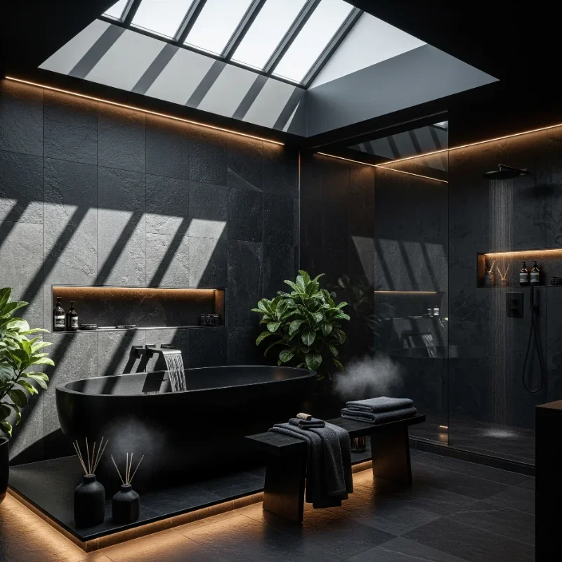 Create your personal spa oasis with a luxuriously dark bathroom! Black tiles, whether matte or glossy, set a sophisticated tone that rivals high-end hotels. Balance is crucial: incorporate white fixtures like freestanding tubs or vessel sinks for contrast. Gold or brass faucets and hardware add warmth and luxury. Large mirrors become essential for reflecting light and preventing claustrophobia. Consider black marble with white veining for natural pattern and movement. Proper lighting transforms everything: install dimmers, add sconces beside mirrors, and consider LED strips under floating vanities. Plush white towels pop beautifully against black walls. Add spa elements like eucalyptus, candles, and bath salts in beautiful containers. This approach works in bathrooms of any size; black can actually make small bathrooms feel more intimate rather than cramped. Your daily routine becomes a luxury experience.