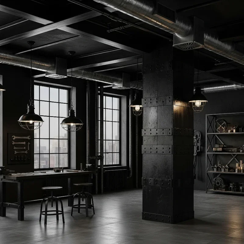 Channel urban loft vibes by combining black with industrial elements! This style celebrates raw materials and exposed structures. Paint brick walls black for dramatic texture, or leave some brick natural for contrast. Exposed black pipes and ductwork become design features rather than eyesores. Choose furniture with black metal frames: shelving units, coffee tables, and chairs with industrial heritage. Add warmth through cognac leather seating or reclaimed wood surfaces. Edison bulb fixtures and wire cage pendants provide perfect lighting while maintaining the aesthetic. Concrete floors or dark tiles complete the look. This style particularly suits open floor plans or actual loft spaces but can work anywhere with the right elements. The combination of black and industrial materials creates spaces that feel both edgy and sophisticated. Your home gains authentic urban character that tells a story.