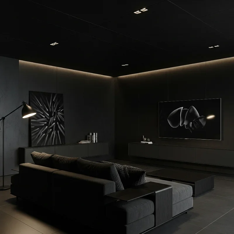 Less becomes infinitely more when you pair black with minimalist design principles! Matte black walls create the perfect backdrop for a curated selection of furniture and art. Choose pieces with clean lines and interesting silhouettes that stand out against the dark background. A white or light gray sofa provides stunning contrast while maintaining the minimalist aesthetic. Keep accessories to a minimum but make them count: one large piece of abstract art, a sculptural floor lamp, or a single dramatic plant. The beauty of this approach lies in the negative space; black walls recede visually, making rooms feel larger when not cluttered. Hidden storage maintains the clean look while providing functionality. This style particularly suits those who find peace in simplicity and order. Your black minimalist space becomes a calming retreat from our chaotic world.