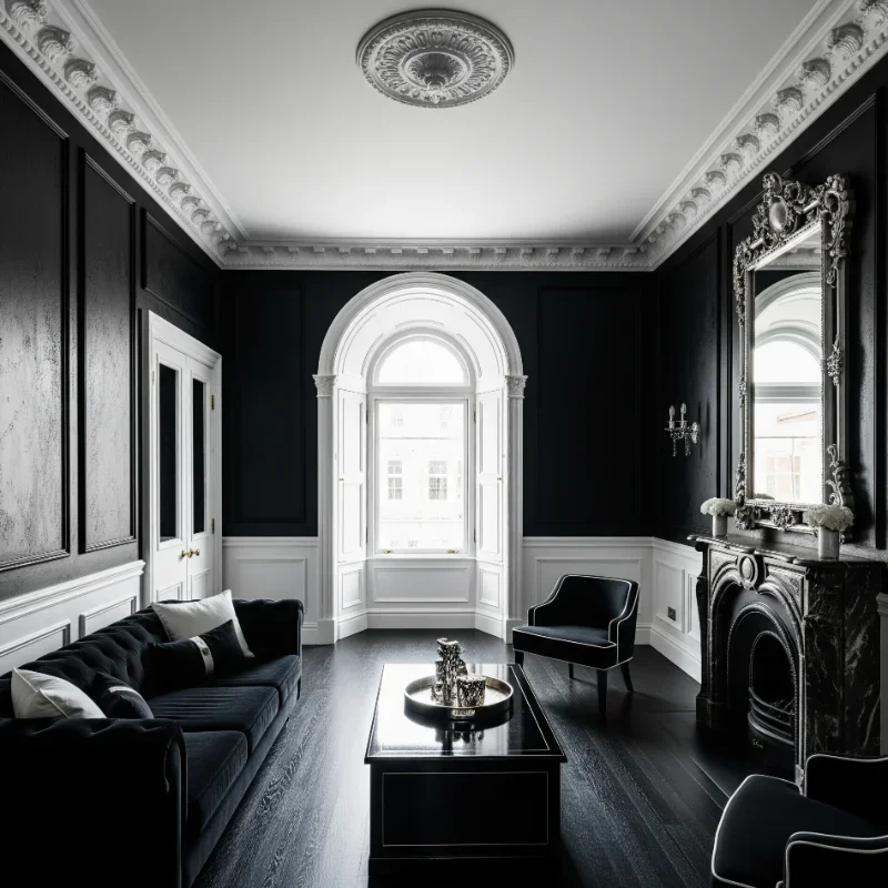Create striking architectural interest by pairing black walls with crisp white trim! This classic combination highlights your home's bones while adding sophisticated contrast. Paint walls in deep black but keep all trim, crown molding, baseboards, and door frames bright white. The contrast draws eyes to architectural details you might otherwise miss. Add white furniture pieces or light-colored rugs to balance the darkness. This approach works beautifully in rooms with interesting architectural features like bay windows, built-in bookcases, or decorative moldings. The white elements prevent the black from overwhelming while creating a graphic, designer look. Consider white ceiling medallions or decorative corbels for extra impact. This timeless combination suits both traditional and contemporary homes, proving that high contrast never goes out of style. Your room gains instant sophistication through this simple yet effective color strategy.