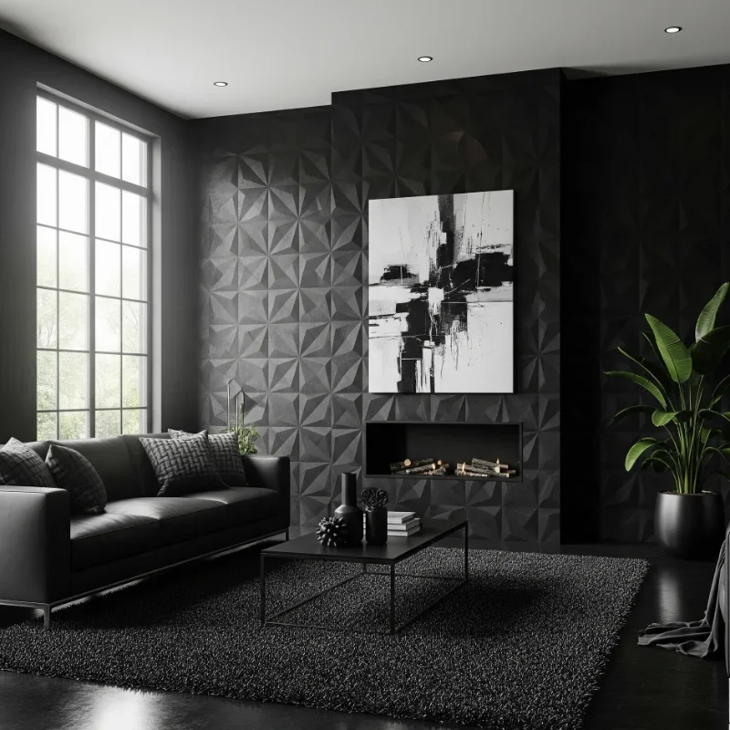Add dimension to your black rooms through textured feature walls that beg to be touched! Options abound: grasscloth wallpaper in deep charcoal, black shiplap for subtle lines, or textured paint techniques that create visual interest. Black brick or stone veneer adds rustic charm while maintaining drama. Consider black acoustic panels that improve sound while looking sculptural. Fabric wall coverings in black velvet or linen create luxury hotel vibes. The texture prevents flat, boring surfaces while adding shadow play throughout the day. Position lighting to graze textured walls, highlighting dimensionality. These features work as accent walls or entire room treatments depending on your courage level. Textured black walls become art installations in themselves, eliminating the need for additional decoration. Your walls gain personality and depth that flat paint simply can't achieve.