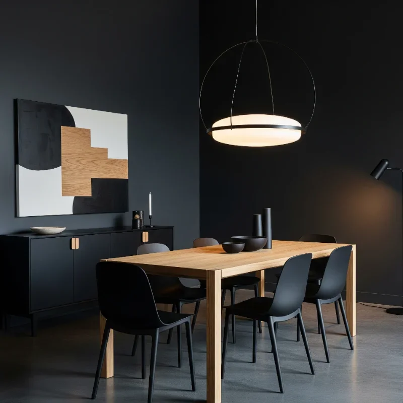 Balance black's drama with the organic warmth of natural wood! This combination brings nature indoors while maintaining sophistication. Choose wood tones that pop against black: light oak, warm walnut, or rich mahogany all create beautiful contrast. A live-edge wood coffee table becomes a focal point against black walls. Floating wood shelves display books and decor while adding horizontal lines that break up dark expanses. Wood floors ground the space and prevent that floating-in-space feeling. Add plants in wooden planters to enhance the natural element. The grain patterns in wood provide texture that plays beautifully with matte black surfaces. This combination works in any room but particularly shines in living rooms and bedrooms where comfort matters. Your space feels grounded and welcoming despite the dark walls, proving black doesn't have to feel cold.