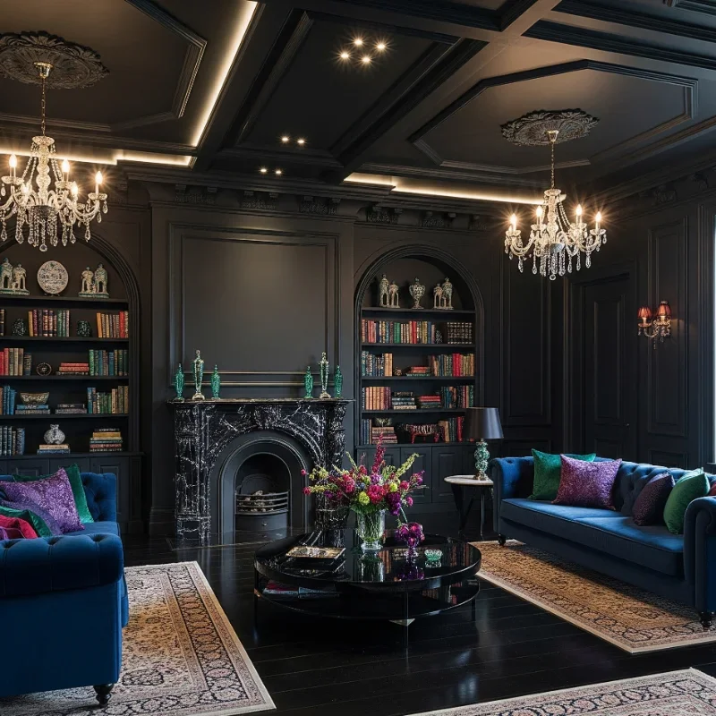Pair black with rich jewel tones for rooms that feel like treasure boxes! Emerald green, sapphire blue, amethyst purple, and ruby red all shine against black backgrounds. These combinations feel luxurious and intentional rather than random. Start with black walls then layer in jewel tones through furniture, artwork, and accessories. A emerald velvet chair or sapphire ottoman becomes a statement piece. Mix multiple jewel tones for maximalist glamour or stick to one for focused elegance. Metallic accents in gold or brass bridge the colors beautifully. This palette works particularly well in living rooms, bedrooms, or powder rooms where drama is welcome. The richness of jewel tones prevents black from feeling flat or boring. Your space becomes a sophisticated jewel box that celebrates color while maintaining elegance through the grounding black base.