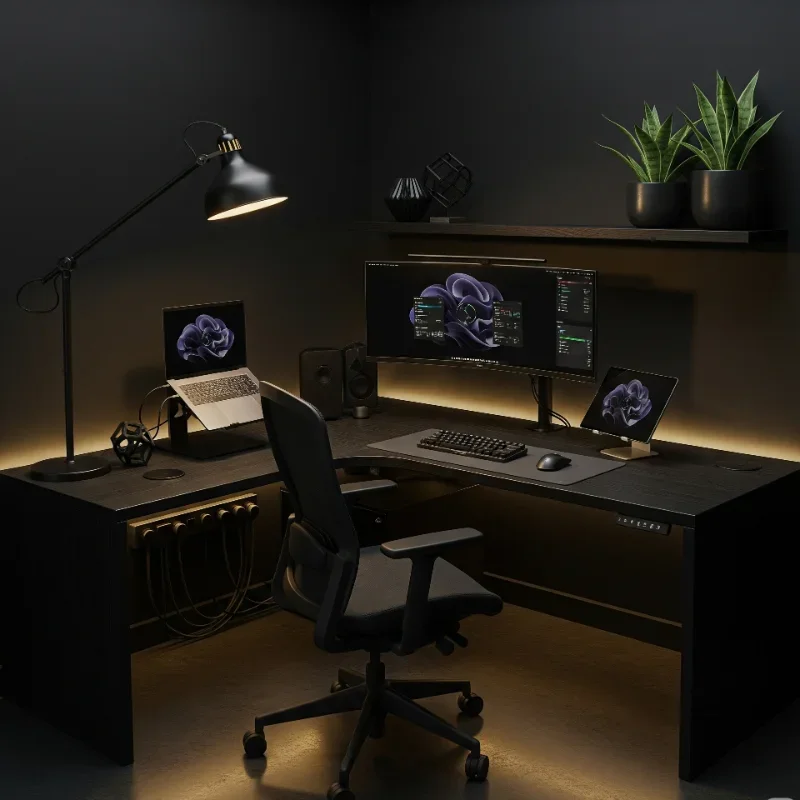 Command respect and focus in a black home office that means business! Dark walls minimize distractions while creating a cocoon for concentration. Position your desk to face into the room with black walls behind you, creating a powerful backdrop for video calls. Add adequate task lighting: desk lamps, overhead fixtures, and bias lighting behind monitors prevent eye strain. Floating shelves in contrasting materials display books and achievements. A comfortable chair in cognac leather or rich fabric provides necessary comfort during long work sessions. Technology in black or metallic finishes maintains the sleek aesthetic. Add personal touches through artwork or plants to prevent sterility. This environment signals to your brain that it's time for serious work. Your home office becomes a professional sanctuary that boosts productivity while impressing clients or colleagues during virtual meetings.