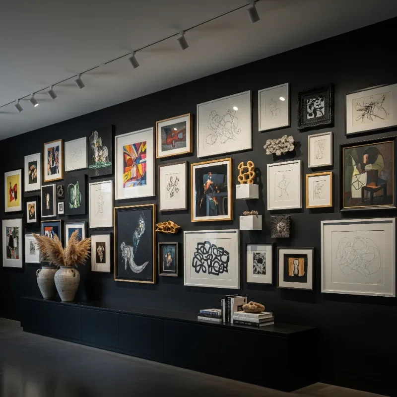 Turn your black walls into a museum-worthy gallery space! Dark backgrounds make artwork pop like nothing else, creating drama and focus. Mix frame colors for interest: gold, silver, white, and natural wood all stand out beautifully against black. The key lies in planning your layout first; use paper templates to experiment before hammering nails. Include various sizes and orientations for dynamic arrangements. Black walls particularly enhance colorful artwork, making hues appear more vibrant. Consider adding picture lights or track lighting to illuminate your collection properly. Mix mediums: photographs, paintings, prints, and even sculptural elements. Personal photos in black and white create sophisticated family galleries. Leave some breathing room between pieces; overcrowding diminishes impact. This approach transforms any wall into a conversation starter while showcasing your personality and interests. Your home becomes a curated space that tells your story.
