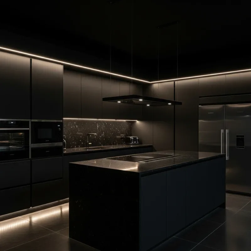 Defy conventional wisdom by bringing black into your kitchen for undeniable sophistication! Black cabinets create a sleek, modern look that hides wear better than lighter colors. Balance with white or light countertops: marble, quartz, or concrete prevent the space from feeling too dark. A stunning backsplash becomes crucial: white subway tiles, metallic mosaics, or natural stone add necessary contrast. Under-cabinet lighting is non-negotiable for both ambiance and functionality. Stainless steel appliances complement black beautifully, while brass hardware adds warmth. Open shelving breaks up solid black expanses while displaying beautiful dishware. Islands in contrasting colors or natural wood create focal points. This bold choice particularly suits those who view kitchens as entertainment spaces rather than purely functional rooms. Your kitchen becomes a sophisticated backdrop for culinary adventures and social gatherings.