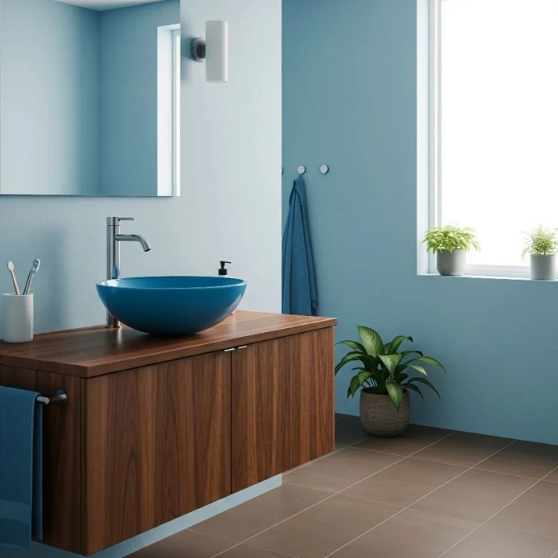 Make a statement with a stunning blue vessel sink atop a natural wooden vanity. This artistic combination turns a functional element into bathroom jewelry. The raised sink becomes a focal point while the wood vanity provides warm, sturdy support. Choose from deep cobalt to soft aqua depending on your style preference. The contrast between smooth ceramic and textured wood grain creates visual interest. It's like displaying a beautiful bowl on a handcrafted table. Vessel sinks work particularly well in powder rooms where they become conversation starters. The wooden vanity can be live-edge for rustic appeal or sleek walnut for modern sophistication. This pairing elevates everyday routines into special moments.