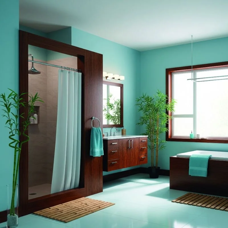 Bring zen vibes to your bathroom with aqua blue walls complemented by natural bamboo elements. This fresh combination creates a spa-like atmosphere that promotes relaxation and rejuvenation. The light, bright aqua energizes without overwhelming, while bamboo adds sustainable style. It's like bringing a tropical lagoon indoors! Bamboo works beautifully for vanities, mirror frames, storage ladders, or accent walls. Its rapid growth makes it an eco-friendly choice that doesn't sacrifice style. The golden tones of bamboo warm up the cool aqua perfectly. This pairing suits minimalist and Asian-inspired design aesthetics particularly well. Add white fixtures and plenty of plants to complete the natural spa feeling.