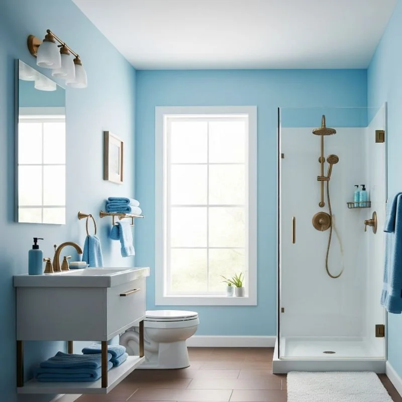 2. Sky Blue Walls with Bronze Fixtures