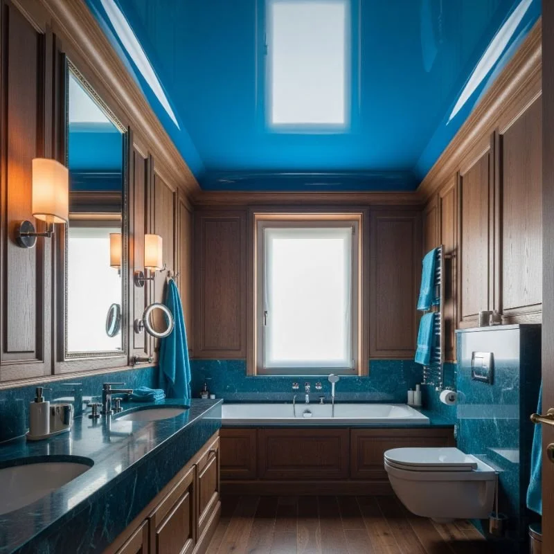 Look up for unexpected beauty! A cerulean blue ceiling in a wood-paneled bathroom creates visual interest and opens up the space. This surprising combination draws the eye upward, making rooms feel taller and more spacious. The wood paneling adds rustic charm while the blue ceiling feels like bringing the sky indoors. Use tongue-and-groove boards or shiplap in warm brown tones for walls. The cerulean ceiling provides a refreshing contrast that prevents the wood from feeling heavy. This design trick works especially well in bathrooms with skylights. Add white trim to create clean transitions between surfaces. The combination suits cottage, farmhouse, and modern rustic styles perfectly.