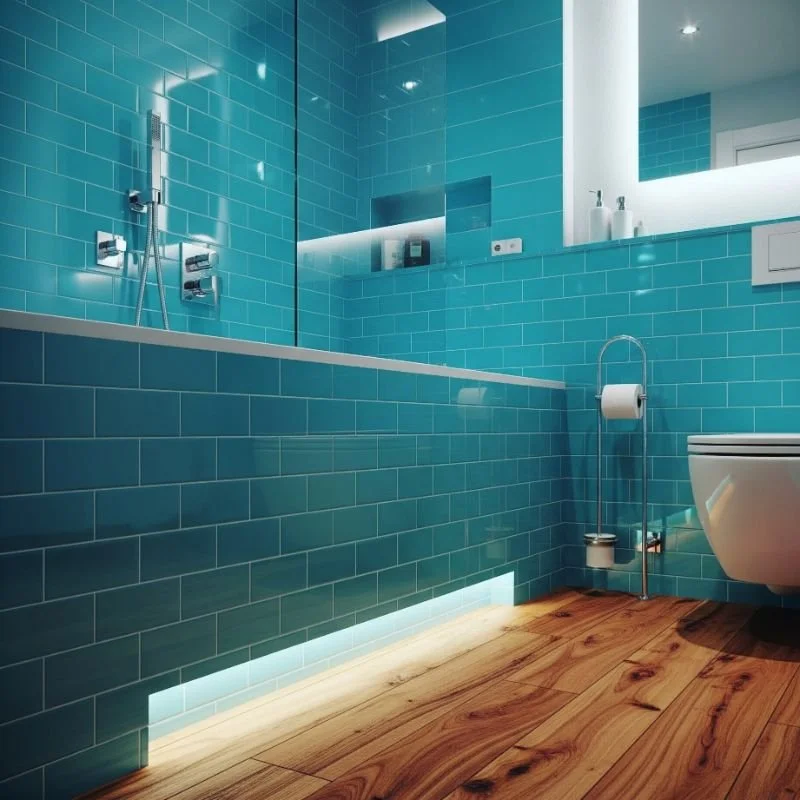 3. Turquoise Tiles and Wooden Flooring