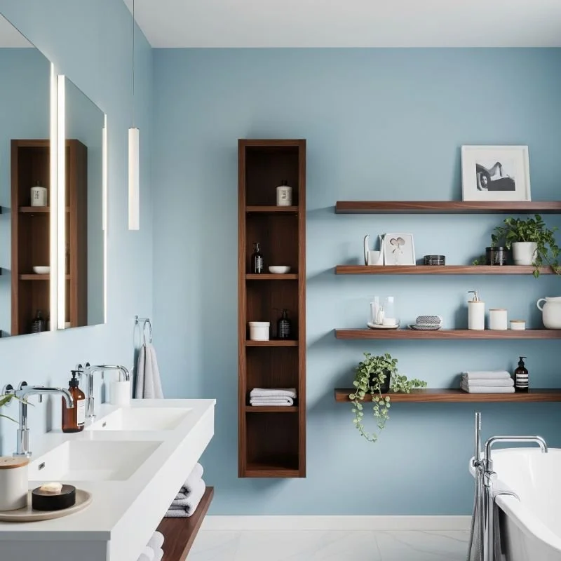 Soft powder blue walls paired with dark wood shelving creates a calming yet functional bathroom space. This gentle combination feels like a cloudy sky grounded by sturdy trees. The light blue opens up the room while dark wood adds storage without overwhelming. Floating shelves in espresso or mahogany tones provide contrast and visual weight. Your toiletries and towels become part of the decor when displayed on rich wood. This color scheme works magic in bathrooms lacking built-in storage. The powder blue reflects light, keeping things bright despite the dark wood elements. Add woven baskets on shelves to soften the look and hide clutter. This timeless combination suits any home style.