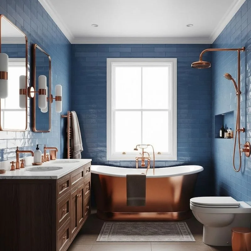 Blue subway tiles paired with copper fixtures and accents create an unexpectedly gorgeous combination. The classic tile shape gets a modern update in shades from navy to cerulean. Copper brings warmth and industrial chic that perfectly complements the cool blue. This pairing feels both vintage and contemporary, like a renovated loft bathroom. The penny-bright shine of copper pipes, faucets, or mirrors adds metallic glamour. Blue subway tiles work on entire walls or as wainscoting with white upper walls. Consider mixing different blue shades for an ombre effect. The copper develops a beautiful patina over time, adding character. This combination particularly suits bathrooms with exposed plumbing you want to celebrate rather than hide.
