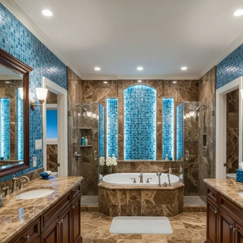 Brown marble countertops or walls provide luxurious elegance, while blue glass mosaic tiles add sparkling personality. This sophisticated combination feels like earth meeting water in the most beautiful way. The natural veining in brown marble creates organic patterns that complement the geometric precision of mosaic tiles. Use blue glass mosaics as accent strips or feature walls. The reflective quality of glass tiles bounces light around, making spaces feel larger and brighter. Brown marble grounds the shimmer with its substantial presence. This pairing suits both traditional and contemporary bathroom styles. Consider backlighting the glass tiles for dramatic evening ambiance. The durability of both materials ensures your bathroom stays stunning for years.
