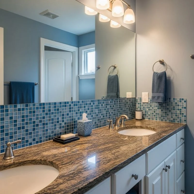 Brown granite countertops provide durability and elegance, while a blue backsplash adds personality and color. This practical combination balances function with style beautifully. The speckled patterns in brown granite complement smooth or textured blue tiles. Choose glass, ceramic, or natural stone tiles in shades from powder to midnight blue. The backsplash protects walls while creating a focal point behind your sink. It's like framing your vanity area with artwork. The granite's natural patterns hide water spots and daily wear. This pairing works with various cabinet colors from white to wood tones. Consider extending the backsplash to the ceiling for dramatic effect. LED under-cabinet lighting makes both elements glow.