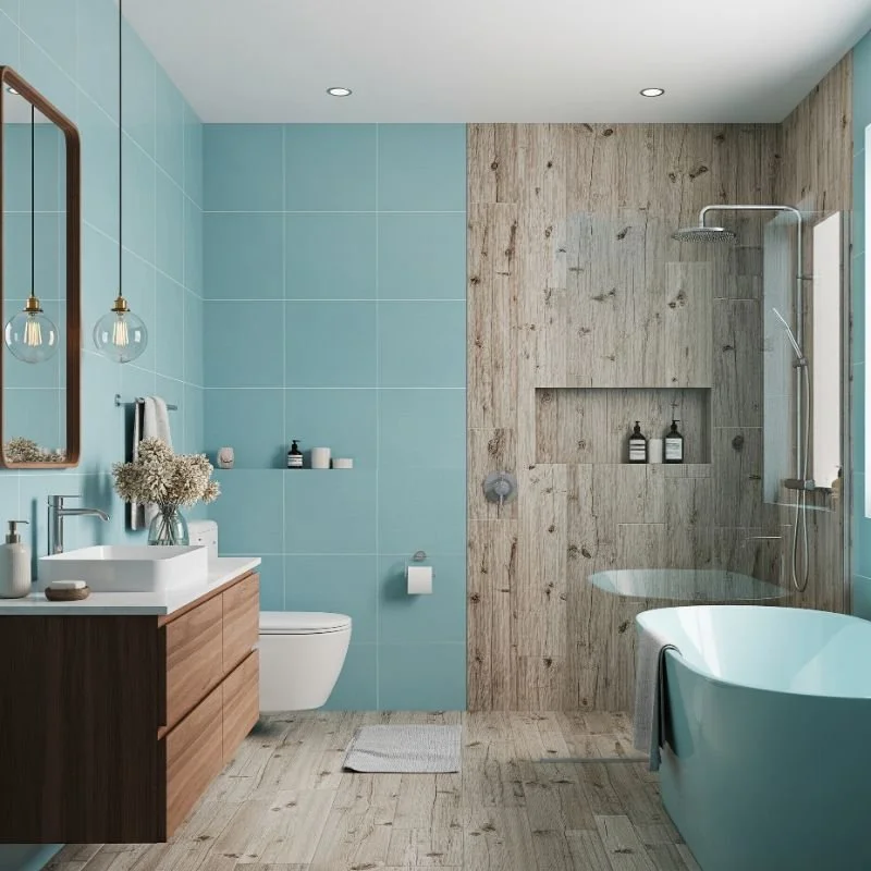 Imagine stepping onto warm wooden floors while surrounded by vibrant turquoise tiles. This combination brings the tropics right into your home! Turquoise tiles on walls or in shower areas create an energizing focal point. The wood flooring grounds the space and adds practical warmth underfoot. It's like having a beach vacation every morning. Choose water-resistant wood or high-quality vinyl planks that mimic wood grain. The turquoise can range from subtle seafoam to bold peacock shades. Mix different tile sizes for added texture and interest. This pairing works particularly well with white grout to make the turquoise pop. Natural light enhances both elements, making your bathroom glow with coastal charm.