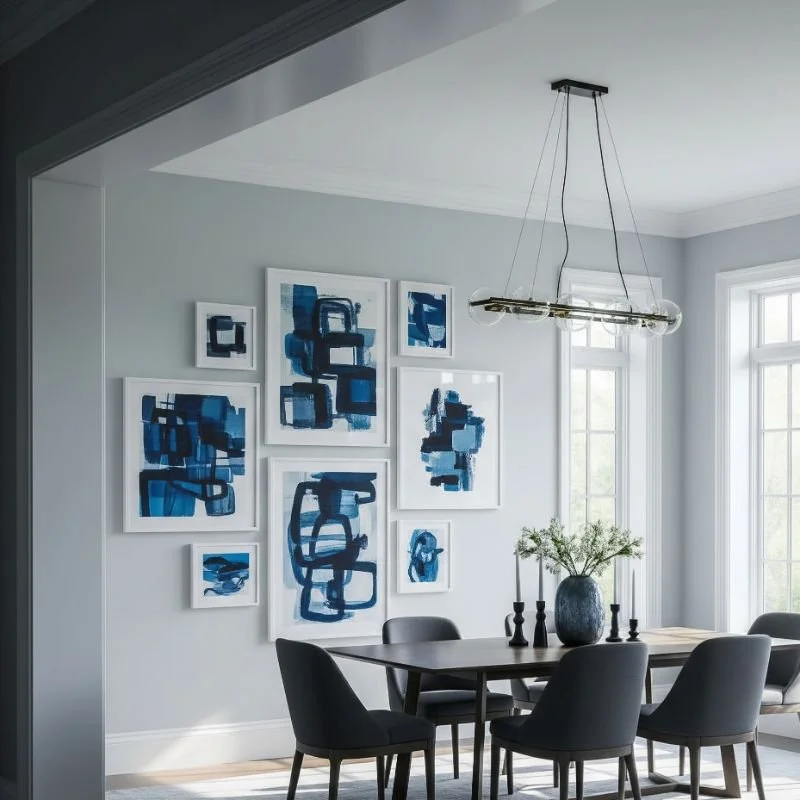 Create a personalized focal point with a gallery wall featuring blue and grey abstract art. This approach adds color and interest without painting or major renovations. Mix different sizes and styles of artwork for an eclectic yet cohesive look. The abstract nature keeps things modern while the color palette maintains elegance. Your gallery wall tells a story and sparks dinner conversation. It's like curating your own museum exhibit! Include various shades of blue and grey to add depth and prevent monotony. Mix frames in silver, grey, or navy for additional interest. Position your gallery wall where it's visible from every seat at the table. This flexible design element grows with your collection and can be easily updated.