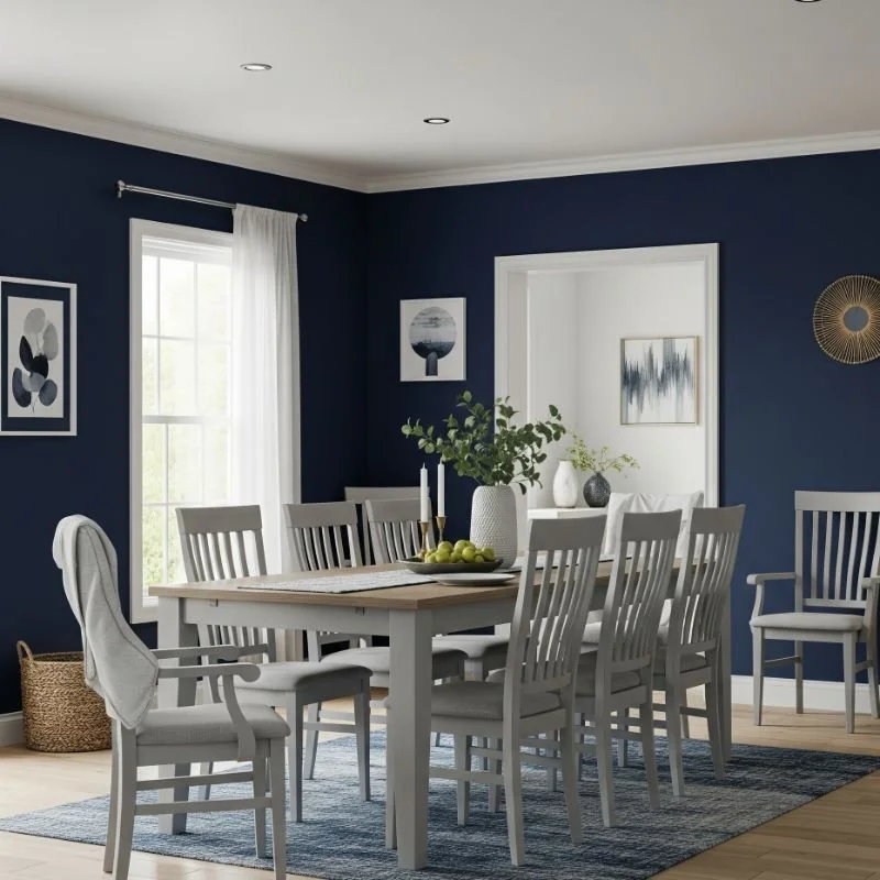 Who says bold colors can't be sophisticated? Navy blue walls create an instant focal point that commands attention while maintaining elegance. Picture this: deep navy enveloping your dining room like a cozy embrace, while light grey furniture provides the perfect contrast. Your dove grey dining table becomes a stunning centerpiece against the rich backdrop. Add silver hardware and crystal glassware to catch the light beautifully. This combination works like a tailored suit, professional yet inviting. The key is balancing the intensity of navy with enough grey elements to prevent the space from feeling too heavy. Consider adding white trim to create clean lines that tie everything together seamlessly.
