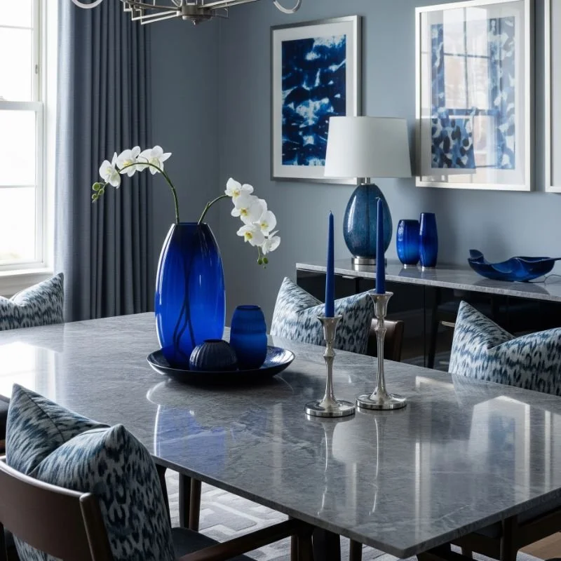 A grey marble dining table epitomizes luxury and serves as a neutral foundation for blue accessories. The natural veining in marble adds organic beauty that no two tables share. Layer on blue elements like vases, candles, or table runners to inject color without permanent commitment. Your marble table becomes a canvas for seasonal decorating. Swap navy accessories in winter for lighter blues in summer. It's like having a designer wardrobe for your dining room! The cool tones of grey marble complement blue perfectly, creating a cohesive look. Add blue-and-white china or glassware to complete the sophisticated palette. The durability of marble ensures your investment looks stunning for years.