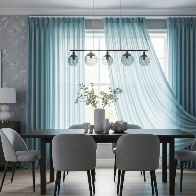 Soft baby blue curtains bring a whisper of color to predominantly grey dining rooms. These flowing fabrics add movement and soften the hard edges of furniture and walls. The gentle blue creates a calming atmosphere perfect for relaxed family dinners. Against grey walls, baby blue curtains look like clouds floating in a stormy sky. They filter sunlight beautifully, casting a serene blue glow during daytime meals. Choose sheer fabrics for maximum light or heavier materials for privacy and drama. The curtains also provide an easy way to change your color scheme seasonally. Layer them with grey valances or tie-backs to create a more structured look that maintains elegance.