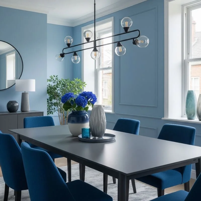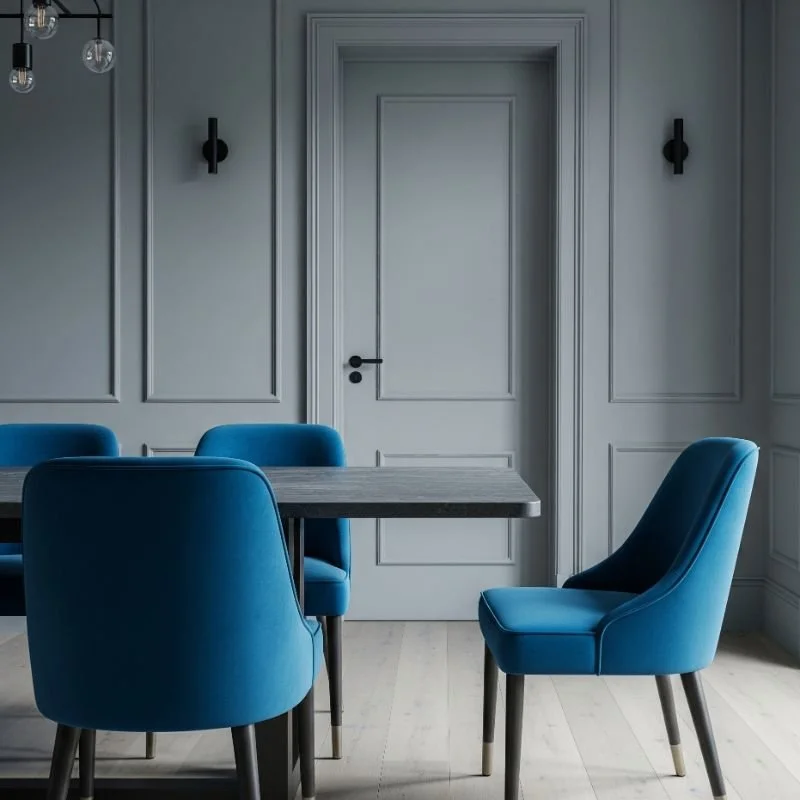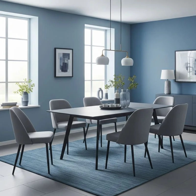 A charcoal grey dining table serves as the ultimate anchor for your room. This dark, dramatic piece grounds your space while blue upholstered chairs add life and energy. The contrast creates visual tension that keeps things interesting. Your charcoal table acts like a stage, allowing blue chairs to perform as the stars. Whether you choose peacock blue or soft periwinkle, the combination never fails to impress. The dark table also hides everyday wear and tear better than lighter options. Consider adding blue placemats or a runner to echo the chair color and create cohesion. This pairing works especially well with metallic accents like brass or copper fixtures.