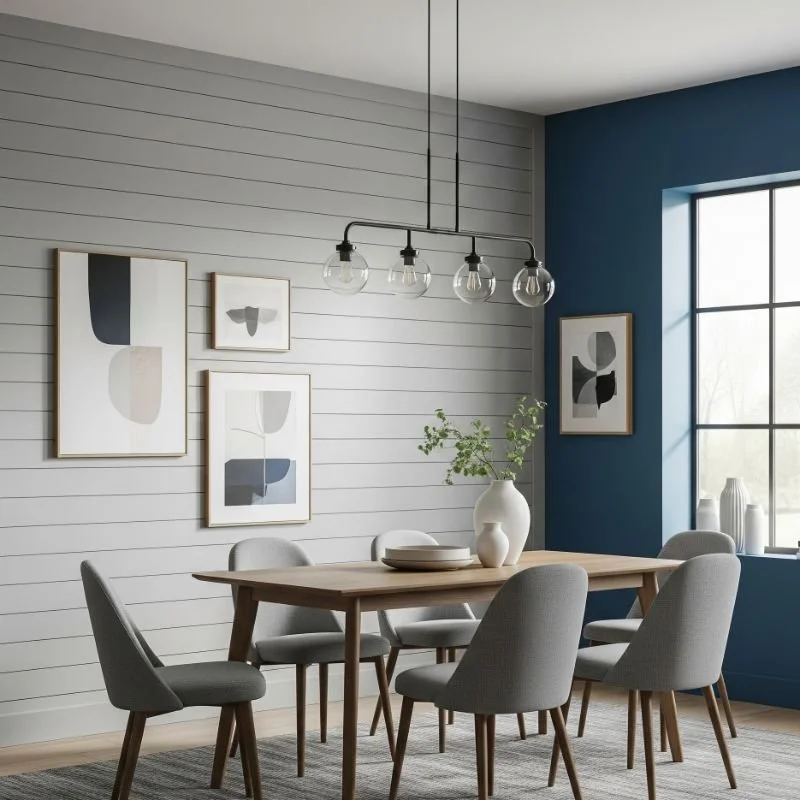Shiplap isn't just for farmhouses anymore! Grey shiplap brings texture and visual interest while maintaining a modern edge. Pair it with one bold blue accent wall, and you've got a dining room that's both trendy and timeless. The horizontal lines of shiplap create movement and make your space feel wider. Your blue accent wall becomes the star, whether you choose cerulean, cobalt, or somewhere in between. This combination feels like a breezy beach house meets city sophistication. The texture of shiplap also helps with acoustics, softening sounds during lively dinner conversations. Consider adding floating grey shelves on your blue wall to display your favorite dishes or decor.