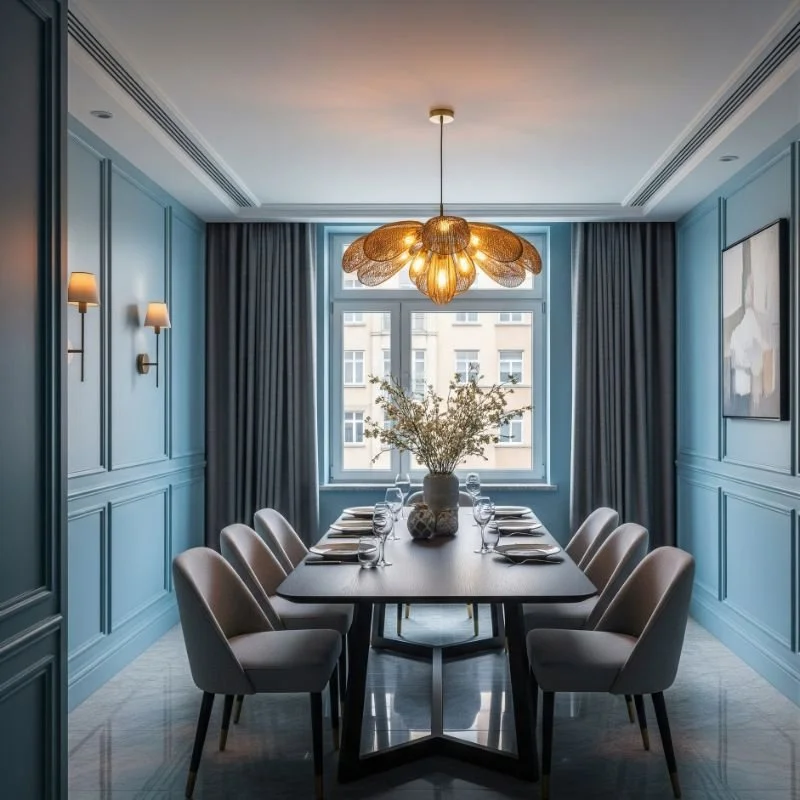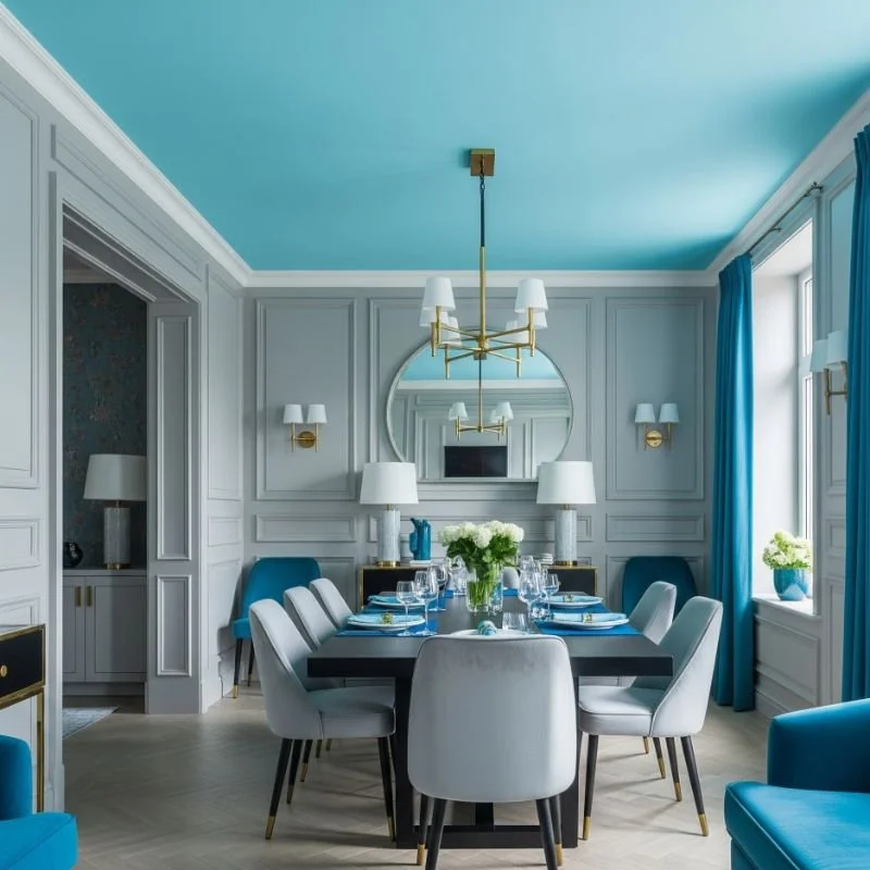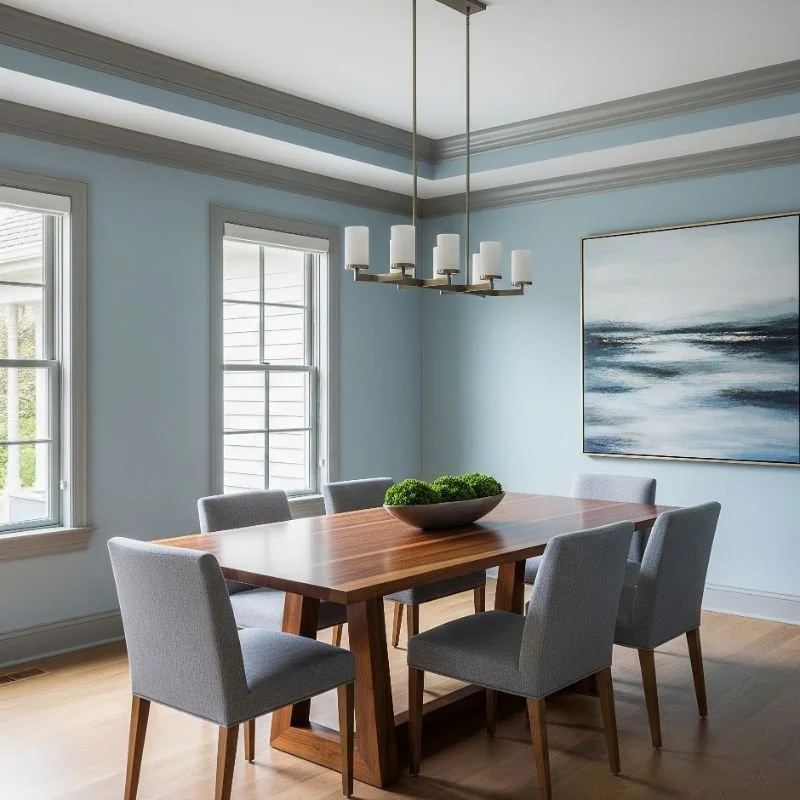 Grey crown molding adds architectural elegance to blue dining room walls. This sophisticated detail creates visual separation between walls and ceiling while adding depth. The grey molding acts like a picture frame, highlighting your beautiful blue walls. Choose a shade slightly lighter or darker than your blue for subtle contrast. This combination feels both traditional and fresh, like updating a classic recipe with modern ingredients. Crown molding also makes ceilings appear higher, creating a grander feel. Paint your ceiling white or soft grey to complete the look. The added dimension helps your dining room feel more finished and polished. Consider adding matching grey baseboards to create a cohesive framework around your blue walls.