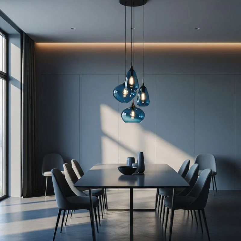 Blue glass pendant lights add sparkle and color while maintaining sophistication in grey dining rooms. These artistic fixtures become functional sculpture, casting beautiful blue shadows when lit. The transparency of glass keeps the look light and airy despite the color. Hang them at varying heights for visual interest or in a straight line for modern simplicity. Your grey backdrop ensures the blue glass remains the star without competing elements. It's like wearing a statement necklace with a simple dress! The play of light through blue glass creates ambiance perfect for intimate dinners. Choose clear cords or grey metal fixtures to maintain the color scheme. Multiple pendants work better than one large fixture for even lighting.