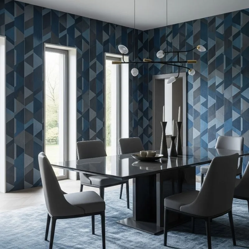 Ready to make a statement? Geometric wallpaper combining blue and grey patterns creates visual interest without overwhelming your space. Think hexagons, triangles, or abstract shapes that dance across your walls. This option works perfectly for those who love pattern but worry about commitment. The beauty lies in how the two colors interact within the design, creating depth and movement. It's like wearing a patterned tie with a solid suit, adding personality while staying sophisticated. Choose larger patterns for spacious rooms or smaller prints for intimate dining areas. The geometric design also helps define your dining zone in open-concept homes, creating a distinct space without walls.