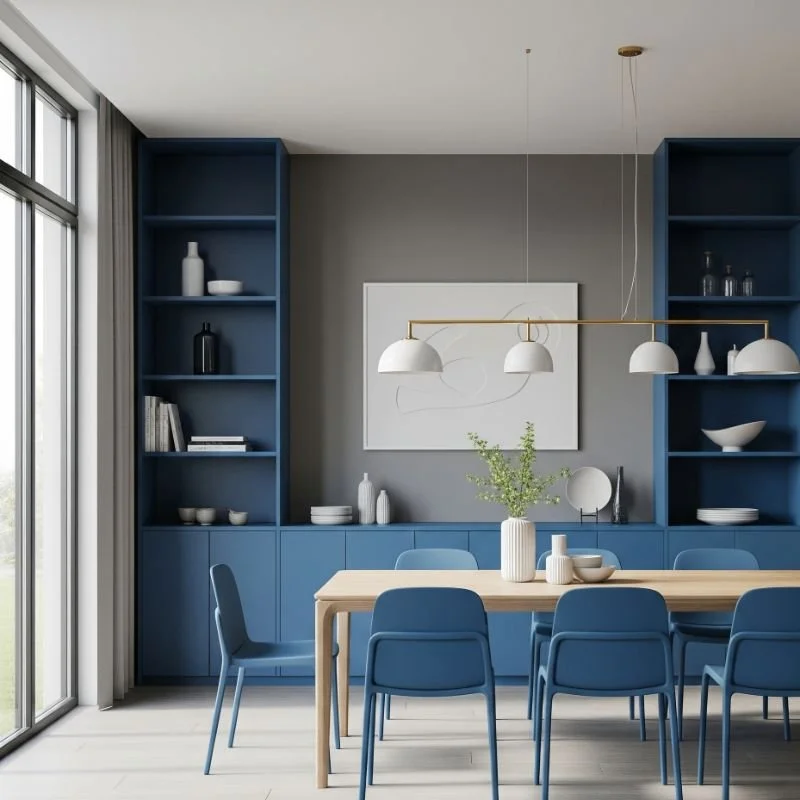 Built-in shelving painted in bold blue creates a stunning focal point against grey walls. These functional beauties provide storage while adding architectural interest to your dining room. Display your finest china, glassware, or decorative objects against the blue backdrop. The contrast makes every item pop like art in a gallery. Grey walls ensure the blue doesn't overwhelm the space, maintaining balance and sophistication. It's like creating a jewelry box for your dining treasures! Consider adding interior lighting to highlight your displays. The combination of open and closed storage keeps clutter at bay while showcasing your style. Paint the back wall of shelving in a slightly different blue shade for added depth.