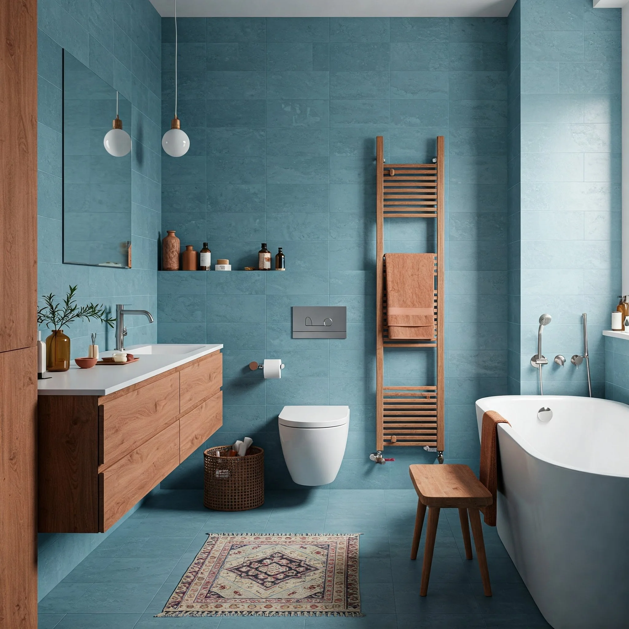 Who says blue has to stand alone? Pairing it with earthy elements can yield an oasis-like ambiance that’s both soothing and grounded. Imagine a weathered wooden vanity set against a dusty blue wall, or driftwood-inspired shelving contrasting aqua tiles. The warmth of natural materials like bamboo, rattan, or reclaimed wood can soften the sometimes “cool” vibe of blue, creating a balanced, spa-like environment. It’s much like sipping a warm cup of tea while gazing at a tranquil lake—pure harmony. Even adding small touches, like baskets for storage or woven blinds, can significantly elevate the look. If you love greenery, consider placing a potted plant on a wooden stool by the bathtub: the lively pop of green against blue and brown hues can evoke a mini tropical retreat in your very own home.