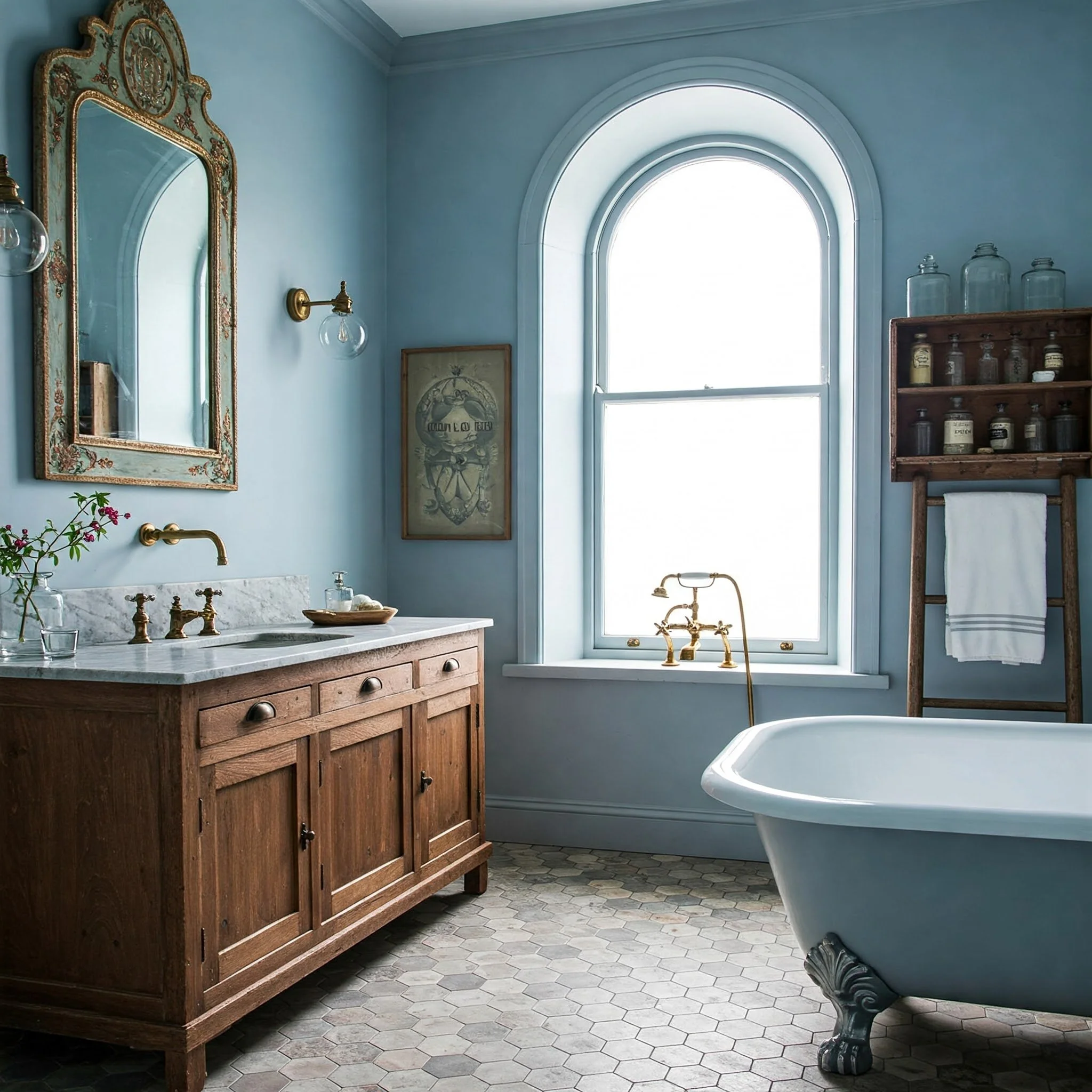 Looking for a bathroom that feels like a charming countryside retreat? Combine blue tones with rustic or vintage elements for a cozy, lived-in vibe. Picture a distressed wooden cabinet painted in a weathered aqua, or an antique mirror that complements a pastel-blue wall. Adding tile with a vintage pattern—perhaps classic hexagons or smaller mosaic squares—further enhances the old-world charm. You might opt for exposed pipes in a brushed brass or bronze finish, reinforcing that rustic aesthetic. And don’t forget the power of decorative trinkets: a repurposed milk crate for towel storage or a vintage sign can imbue character into an otherwise straightforward design. Pairing these weathered touches with blue color schemes is like stepping into a nostalgic painting—you instantly feel warmth, history, and a sense of belonging.