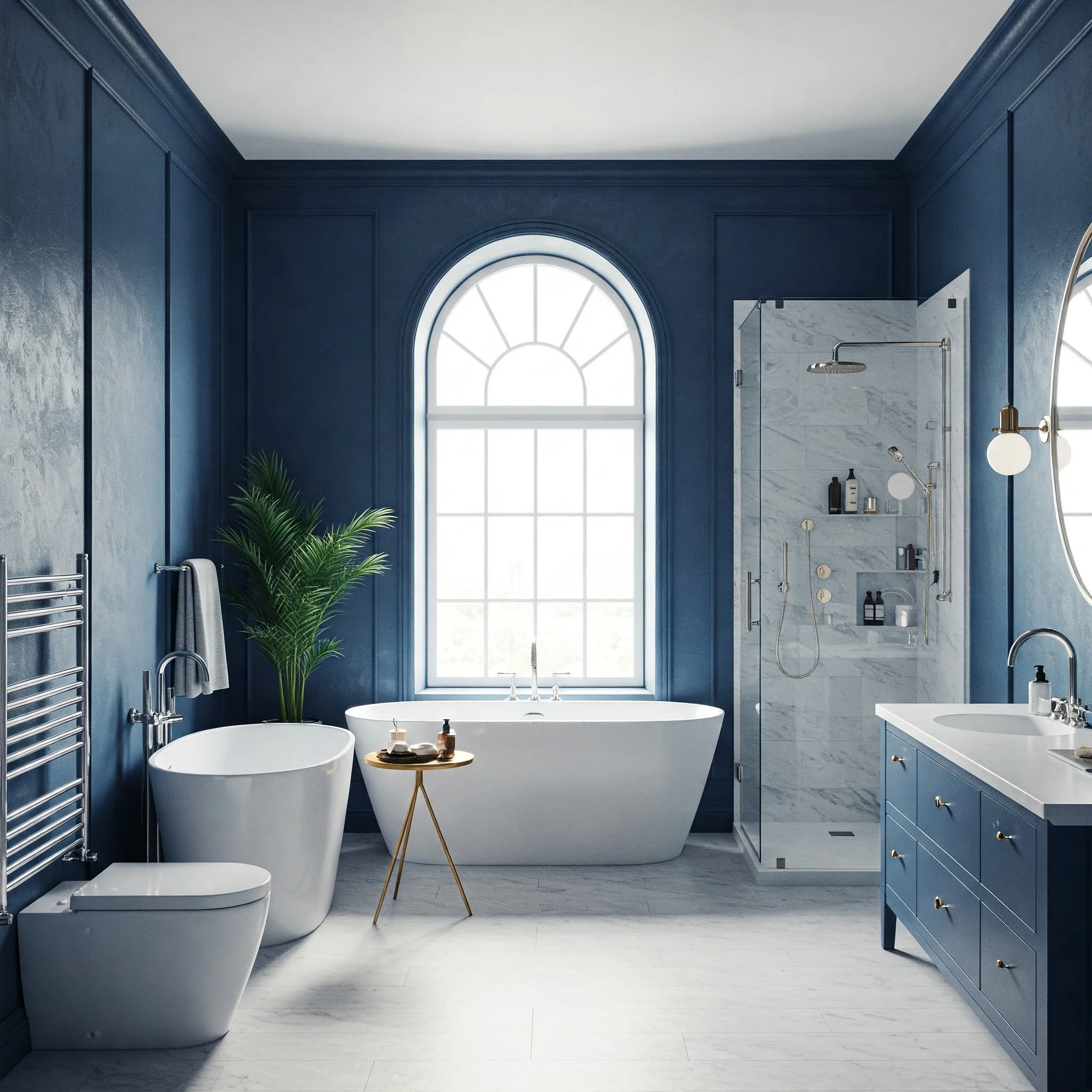 If you’ve ever gazed at a starry night sky and felt instantly at peace, consider channeling that vibe with navy statement walls in your bathroom. Navy brings a sense of depth and sophistication that few other colors can match. And while it might sound dramatic, pairing a navy accent wall with white fixtures can create a clean, modern look, almost like crisp linens against a deep-blue canvas. You could choose to paint just one wall for a subtle statement, or be bold and coat the entire room in a rich navy hue. To keep things feeling balanced, add lighter elements: a cream-colored rug, pale mosaic tiles, or a few well-placed mirrors. The interplay of dark and light not only enhances the sense of space but also evokes a restful, cave-like retreat perfect for recharging after a long day.