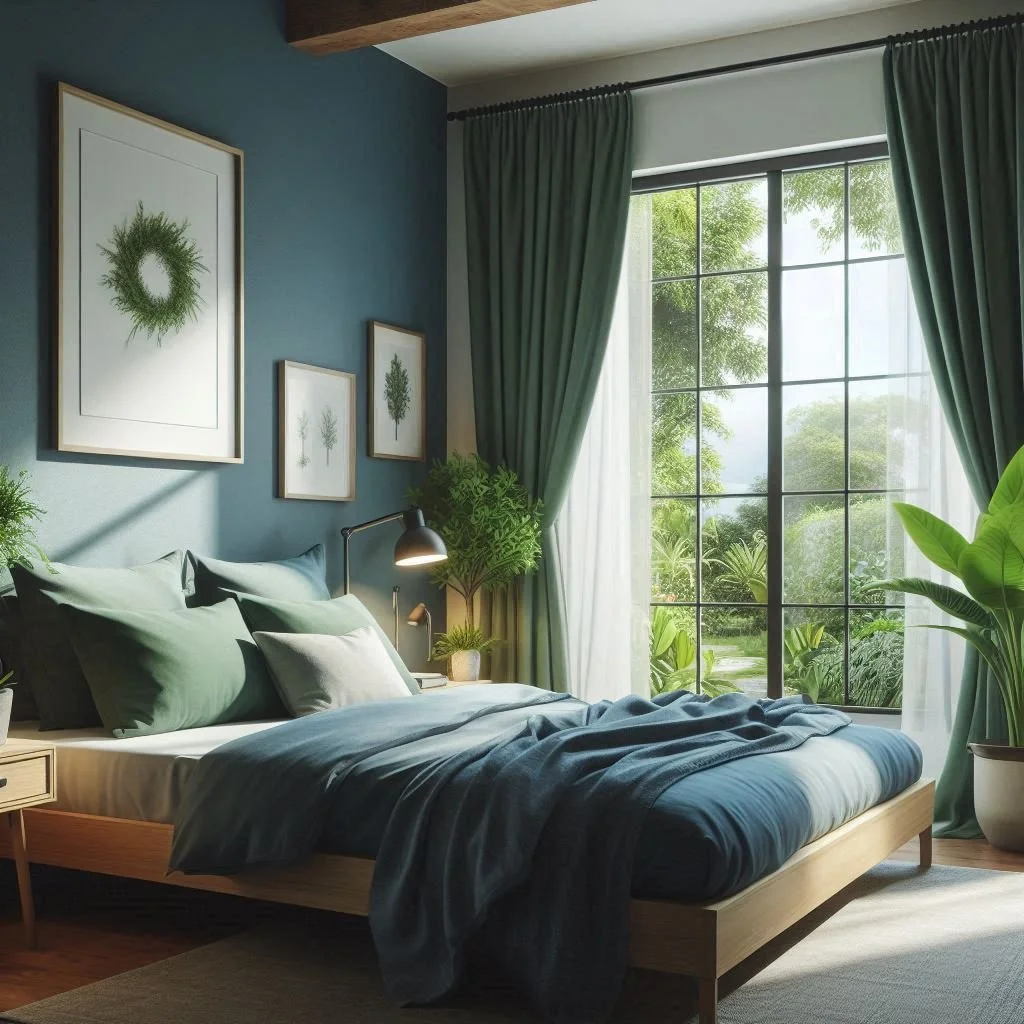 Blue and green are a harmonious duo, making them a perfect choice for bedroom decor that feels fresh and inviting. Incorporate potted plants or hanging greenery into your blue-themed bedroom to create a lively contrast and introduce a natural, organic element. The vibrant greens of the foliage beautifully complement blue walls, bedding, or accents, adding depth and vitality to the space. This combination not only softens the overall look but also brings the tranquility of the outdoors inside, enhancing the room’s calming atmosphere. Choose plants like trailing ivy, ferns, or succulents for a touch of texture and variety. Arrange greenery on shelves, nightstands, or in hanging baskets to maintain balance without cluttering the space. By blending the serene tones of blue with the lively energy of green, you’ll create a bedroom that feels both refreshing and effortlessly connected to nature.