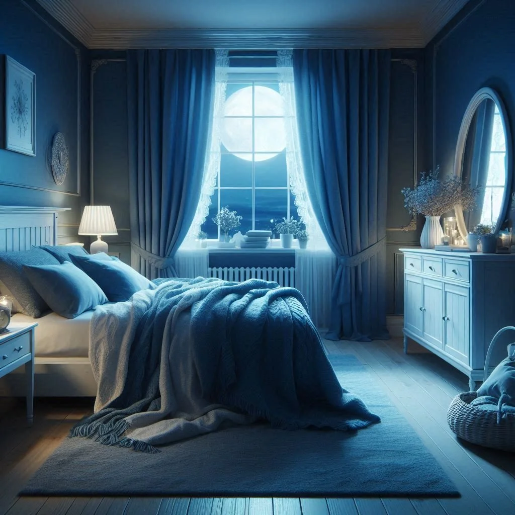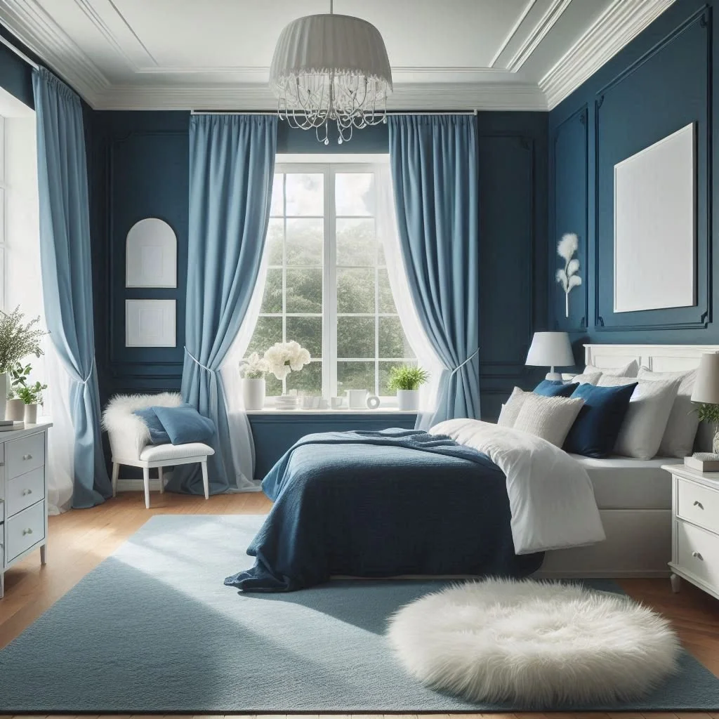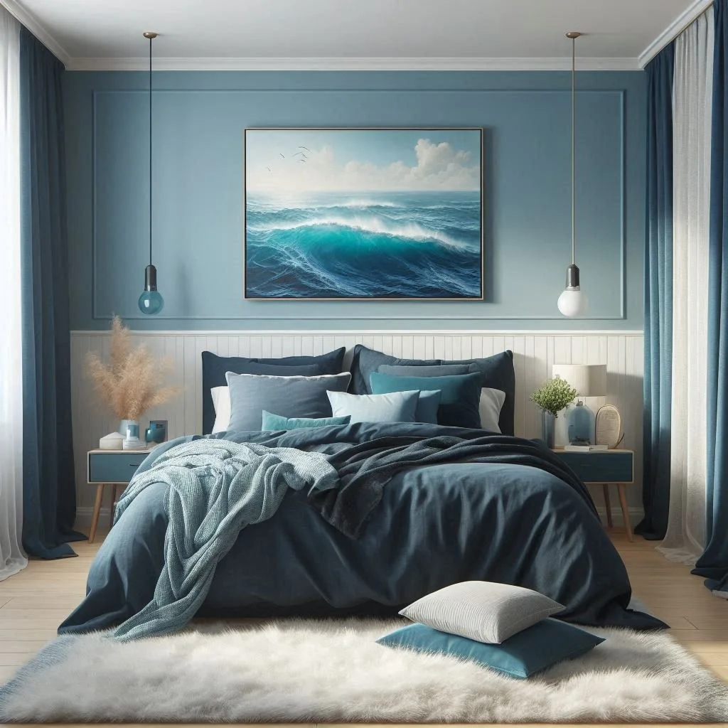 Midnight blue brings an air of sophistication and comfort to your bedroom, wrapping the space in a velvet-like embrace. This rich, dark shade is perfect for creating a cocoon-like effect that feels both cozy and luxurious. Use midnight blue on walls for a bold, dramatic backdrop or incorporate it through plush bedding and curtains to evoke a sense of depth and serenity. To balance the dark tones, add warm, ambient lighting with table lamps or sconces that create a soft glow. Metallic accents in gold, brass, or copper, such as mirrors, picture frames, or decorative trays, enhance the luxurious feel while reflecting light for added warmth. Pair the midnight blue with neutral or soft-colored furniture to maintain a harmonious look. This combination transforms your bedroom into a serene retreat, perfect for relaxing and recharging in ultimate comfort and style.