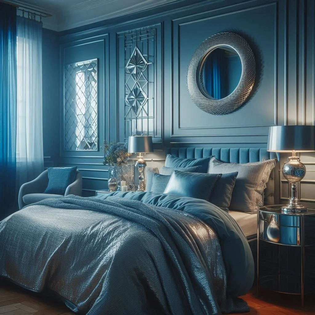 Blue and metallics are a perfect pairing, creating a timeless and sophisticated design aesthetic. The richness of navy blue paired with the elegance of gold accents makes for a stunning combination. Picture a navy blue headboard complemented by sleek gold bedside lamps, adding warmth and luxury to your bedroom. For a softer, more understated glam look, opt for pastel blue walls accented with silver-framed mirrors or metallic decor. This blend of subtle blue tones and cool metallics creates a refined and airy feel, ideal for those seeking a touch of glamour without overwhelming the space. Whether you prefer bold contrasts or a gentle shimmer, blue and metallics work beautifully together to elevate your room’s style. Incorporate textured fabrics and complementary lighting to complete the look, transforming your space into a chic and inviting retreat.