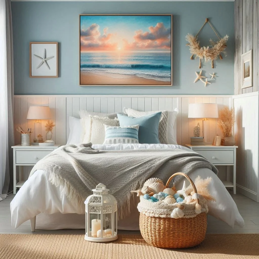 If you’re dreaming of the beach, coastal blues combined with natural materials like wood and rattan can bring that serene, ocean-inspired vibe into your home. Start with light blue walls to mimic the sky and sea, creating a calming and breezy backdrop. Complement this with sandy-toned rugs and furniture crafted from natural materials like weathered wood or woven rattan to add warmth and texture. Incorporate shell-inspired decor, such as vases, artwork, or throw pillows, to enhance the coastal aesthetic without overpowering the space. Soft, flowing curtains and light fabrics further contribute to the laid-back feel, while accents like driftwood or seagrass baskets tie the look together. By blending these elements, you can craft a tranquil and inviting space that captures the essence of the coast, offering a relaxing retreat that brings the beauty of the beach right into your home.