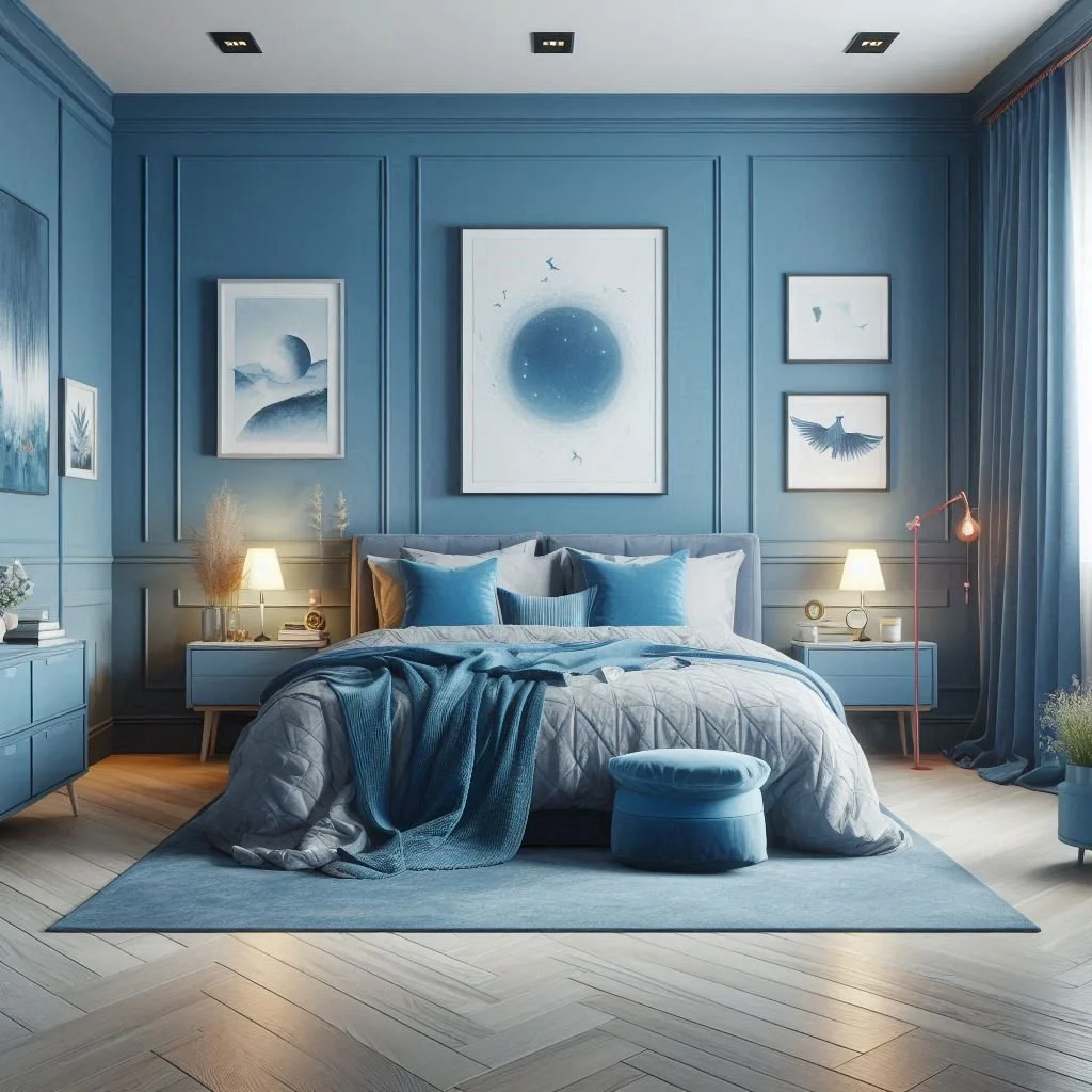 Blue and gray are a dynamic duo in contemporary design, offering a sleek and harmonious balance that feels both modern and timeless. Combining these two tones creates a refined aesthetic with plenty of versatility. For a bold statement, opt for darker blue walls paired with light gray bedding and furniture, adding contrast and depth to the space. Alternatively, flip the palette by using soft gray walls and incorporating navy or cobalt blue accents through throws, cushions, or curtains to maintain visual interest. This interplay between the two shades keeps the room dynamic yet cohesive, perfect for a calming and stylish retreat. Add texture through fabrics like velvet or linen and incorporate metallic or wood accents to enhance the design’s depth. With the right mix, blue and gray effortlessly create a polished and contemporary space that’s both inviting and sophisticated.