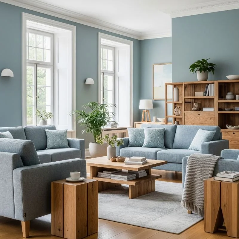 Create organic tranquility by pairing soft sage blue elements with natural wood furniture and accents that celebrate the calming connection between water and earth tones. This nature-inspired combination works like bringing peaceful forest streams indoors, creating spaces that feel both grounding and refreshing. Sage blue's gray-green undertones complement wood's warm honey and amber tones beautifully, whether featured in painted walls, upholstered furniture, or decorative accessories. The key involves choosing wood pieces with visible grain patterns that add texture and interest while maintaining the organic, natural feeling. Consider incorporating plants and natural fiber textiles that enhance the connection to nature while adding layers of green that bridge the blue and wood elements seamlessly. This harmonious pairing transforms living rooms into serene retreats that celebrate natural beauty while maintaining sophisticated style that feels both timeless and contemporary.