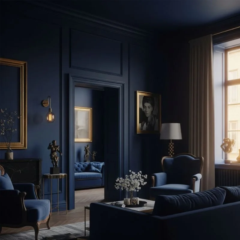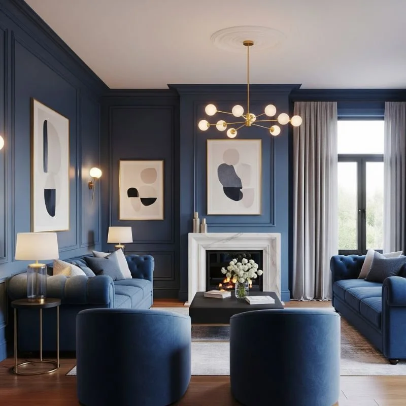 Create dramatic, cozy atmospheres using deep midnight blue that transforms your living room into an intimate retreat perfect for evening relaxation and sophisticated entertaining. Midnight blue works like wrapping your space in velvet, creating cocoon-like environments that feel both protective and luxurious. This rich, dark color makes metallic accents sparkle like stars while causing white and cream elements to glow with luminous beauty. Balance the intensity with strategic lighting, incorporating warm-toned lamps, candles, and string lights that create ambient illumination without harsh brightness. Layer different textures to prevent the dark color from feeling flat, mixing smooth painted surfaces with nubby fabrics, glossy ceramics, and matte metals. This bold choice transforms living rooms into sophisticated sanctuaries that feel more like luxury hotel lounges than ordinary family spaces, perfect for creating memorable evenings and intimate gatherings.