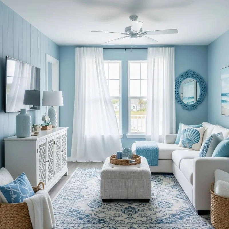 Create the ultimate seaside escape in your living room using classic coastal blue and white combinations that capture the essence of ocean breezes and sandy beaches. This timeless pairing works like visual vacation therapy, instantly transporting you to peaceful shorelines regardless of your actual location. Layer different shades of blue from soft sky tones to deeper ocean hues, then balance them with crisp whites and natural textures like rope, driftwood, and woven materials. Incorporate nautical elements thoughtfully, perhaps through striped patterns, sea glass accessories, or coral-inspired decor that enhances rather than overwhelms the coastal theme. The beauty of this combination lies in its ability to feel both relaxing and refreshing, creating spaces that energize while maintaining that coveted calm atmosphere. This approach transforms ordinary living rooms into coastal retreats that celebrate the timeless appeal of seaside living.