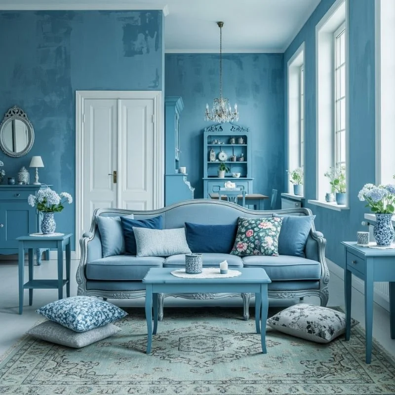 White, cream, gray, natural wood, and metallic accents work beautifully with blue.