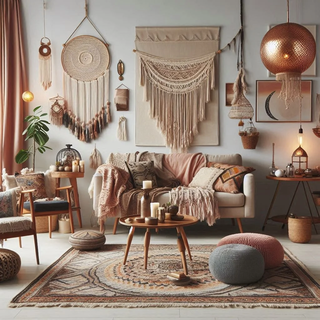 Macramé wall hangings, curtains, and cushions can infuse your living room with distinctive bohemian charm. Opt for handmade items showcasing intricate patterns and textures to elevate the space. These elements bring a sense of artistry and craftsmanship, which is central to boho chic decor. Complement these with woven throws and embroidered pillows to add warmth and a touch of coziness. The blend of these textiles not only enhances the eclectic feel of the room but also creates a visually appealing and inviting atmosphere. Their unique designs and textures contribute to a rich, layered look, making your living room a comfortable and stylish retreat.