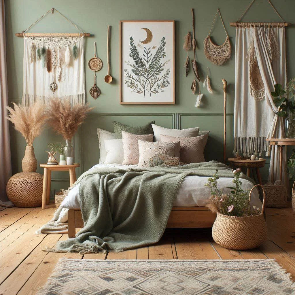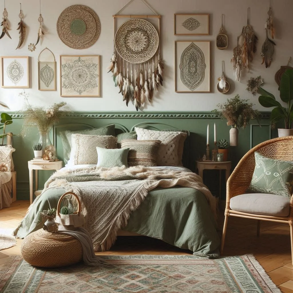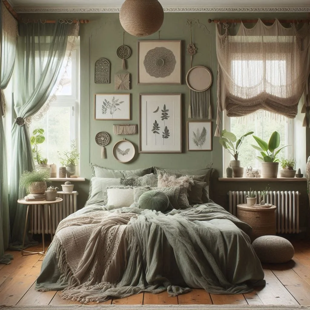 2. What colors go well with sage green in a boho bedroom?
