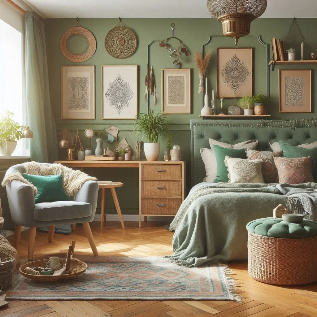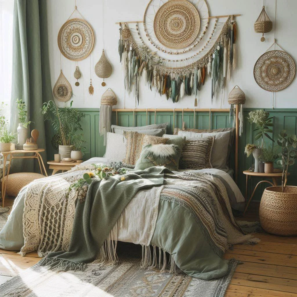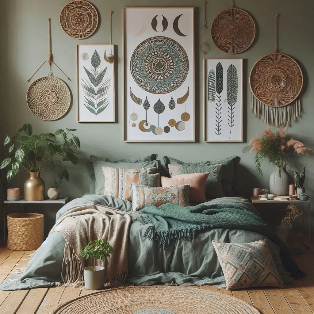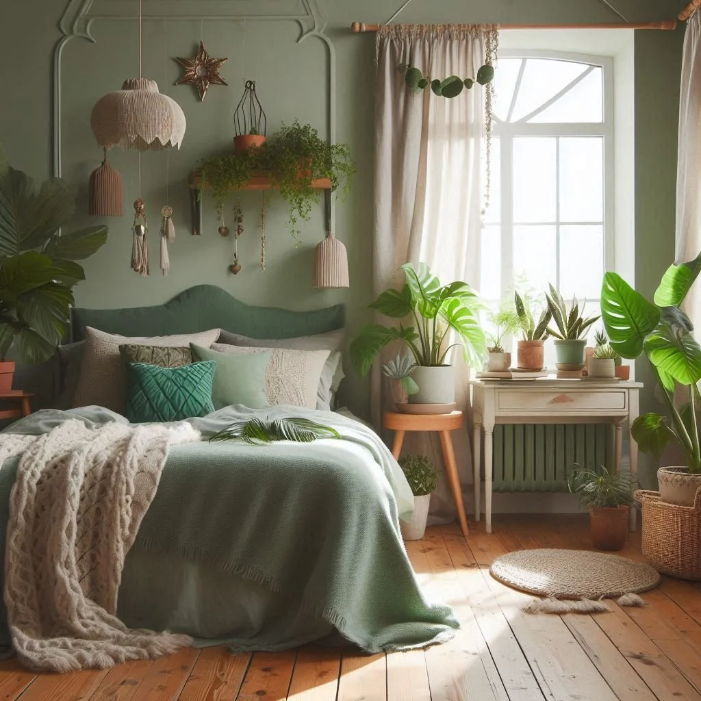 2. What colors go well with sage green in a boho bedroom?