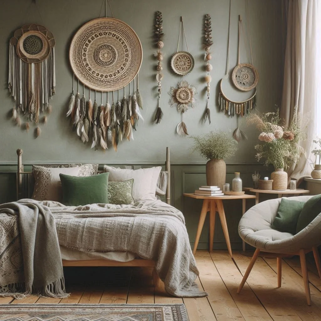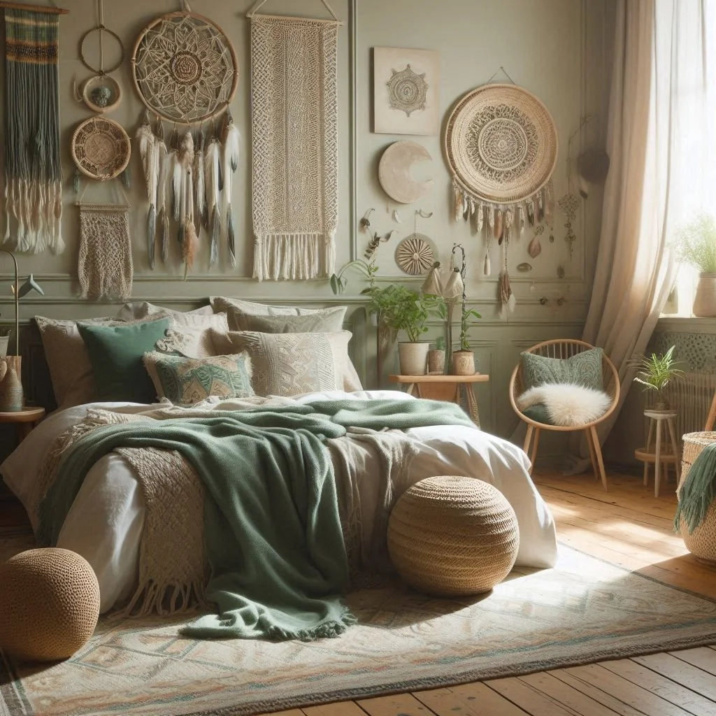 Handcrafted accessories infuse your bedroom decor with a personal and unique charm. Opt for ceramic vases, handmade trays, or artisanal bowls in sage green or neutral tones to enhance the boho vibe. These distinctive pieces not only serve as stylish decor but also offer practical functions, like holding jewelry or candles. By integrating handcrafted items, you add a layer of texture and authenticity to your space, enriching it with a touch of artistry and craftsmanship. Each accessory contributes to a cozy and creatively curated environment, reflecting your individual style and values. This approach creates a bedroom that is not only visually appealing but also a true reflection of your personality and taste.